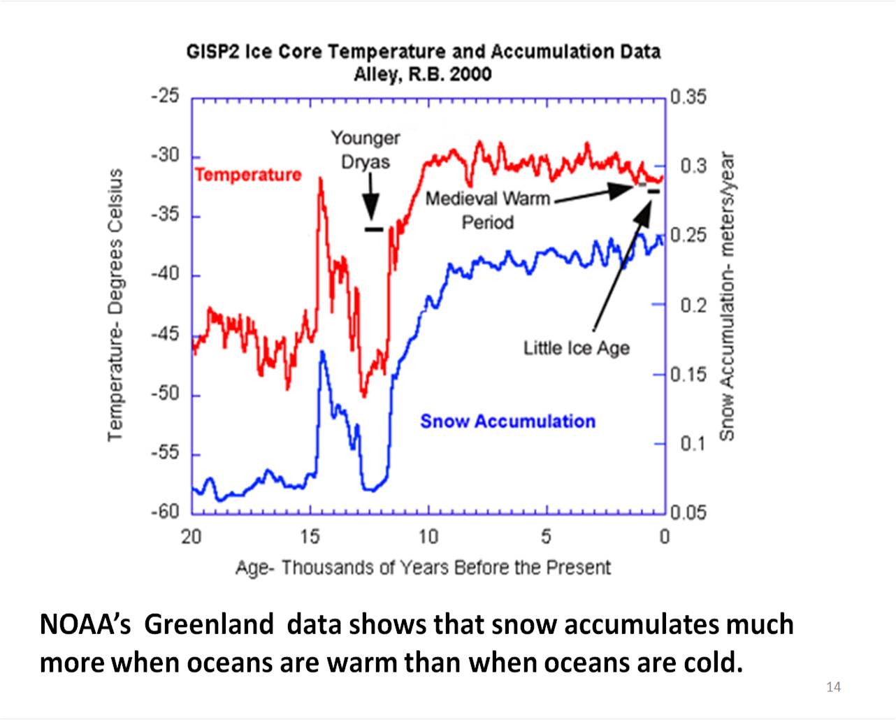 You can see that when the earth is cold, it don't snow much and Snow Accumulation is very low. You can see that when the earth is warm, it snows more and Snow Accumulation is much higher. NOAA's data does show this. NOAA's climate theory and models do it different. They increase ice volume during the very cold periods of the ice age when it is not snowing much.