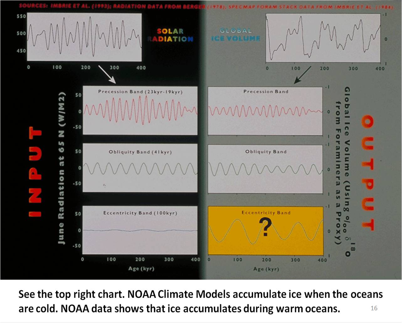 This NOAA chart also shows the improper ice volume. It shows that ice volume reached a maximum, twenty thousand years ago and that miles thick ice sheets melted quickly while the earth warmed. It also shows the solar cycles and orbit cycles that they believe are responsible for the ice age and global warming cycles. I fail to see how they make a connection between the data presented on this chart and the actual climate cycles. Their Climate Theory is very wrong about ice volume.