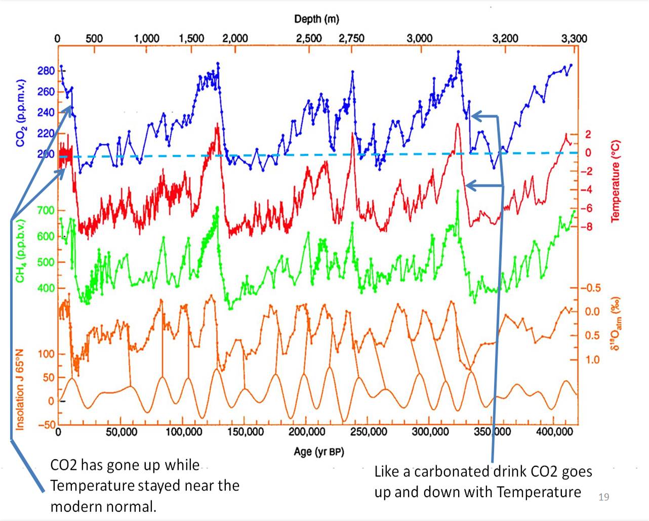 Earth, with oceans holding huge amounts of CO2, is like a huge carbonated drink. If you open a warm carbonated drink, it fizzes like crazy. If you open a cold carbonated drink, it doesn't fizz much. CO2 in the atmosphere naturally goes up and down with ocean temperature. Climate Scientists looked at this and decided that the CO2 was driving temperature. They built their theory and models around this idea. Their famous, or infamious CO2 Climate Sensitivities most likely come from this. Their models did not yield the correct temperatures using real physics. They then added the little understood carbon feedback terms to their models and tweaked the coefficients until the models matched temperatures. When they got a match, they said the match proves the models are correct. That is not proof. What they have are Curve Fits and not Models. I worked at NASA for 44 years and do know the difference between a model and a curve fit and I recognize when data is in a stable cycle. You can see that CO2 has been rising during the most recent 10k years, while temperature was hanging around the modern normal. A well know Consensus Climate Scientist told me that correlation is not causation. He aimed it at my theory, but it applies to his Consensus Theory as well. They use correlation as conformation of causation all the time.