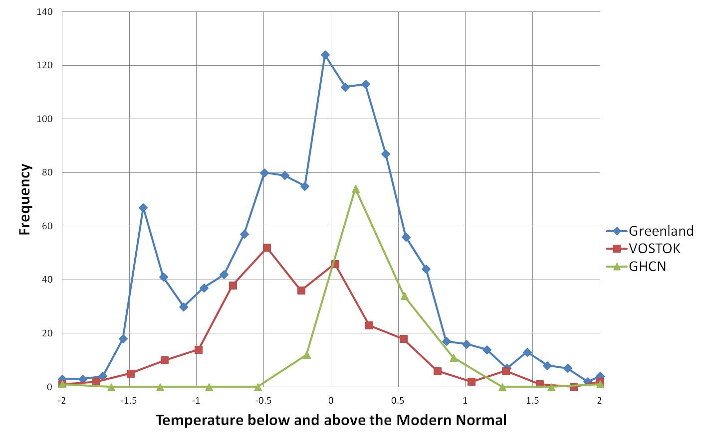 Histograms of Temperature data from Antarctic ice cores and Greenland ice cores for the past ten thousand years and modern instrumented records over the past 130 years, all fall in the same range and all are representative of well bounded data that is not about to suddenly go unstable. None of the data exceeds plus or minus two degrees from the modern normal. Most of the data does not exceed plus or minus one degree from the modern normal. Most of the data is closer to the center and not the edges. This is normal, well bounded, data.