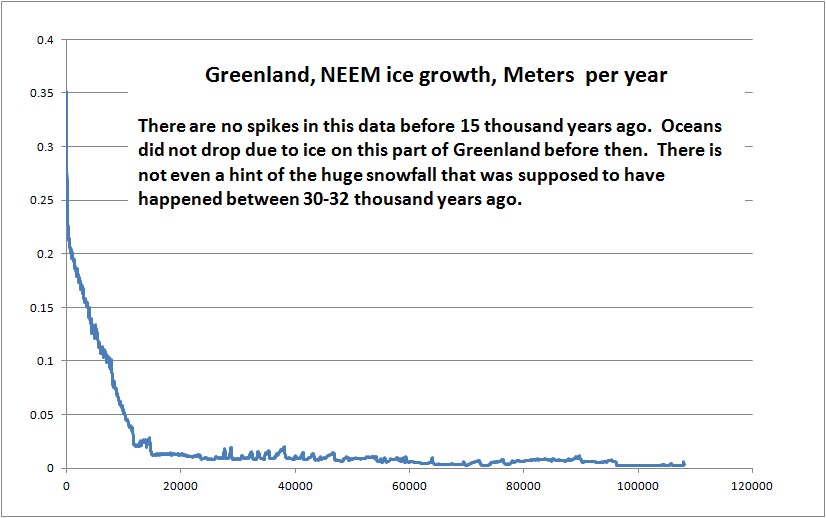 This does support the idea that the steps in the temperature data, over the past 108 Thousand years are steps in the ice sheet advance and not new snowfall. The ice sheet was advancing and thinning. The evidence of new snowfall was found because they believed it happened and struggled to believe anything they found that would support that idea. NEEM and Vostok, page before this one, do not show the spikes in snowfall that were supposed to happen in the cold frozen time. They did not happen. Those spikes were ice advance spikes.