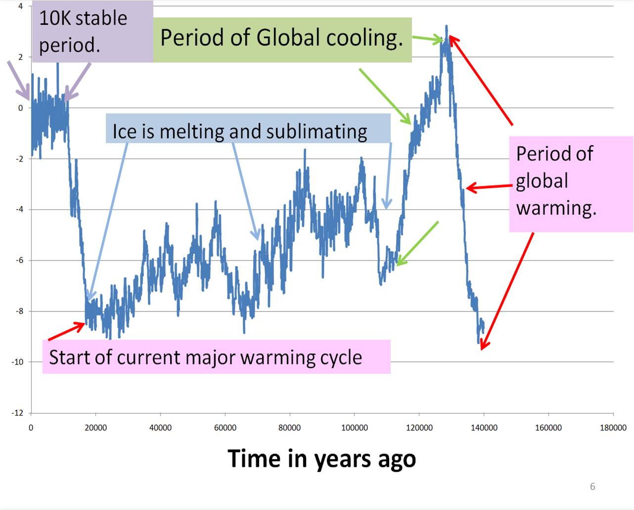 We will start in the middle of the long cold phase on this chart, which is much like the older cycles off to the right. The long cold period, when the oceans are frozen, are times of not much snow falling due to lack of a source of moisture. This is when miles thick ice sheets melt and sublimate. They thin, but they do not retreat. Albedo stays high and Earth stays cold, like an ice chest stays cold while the ice melts. The oceans rise, some, but a lot of the water is trapped. The long cold cycle ends and the Earth starts to warm as the ice sheets retreat. The oceans warm and rise. Trapped water is released and the oceans rise more. At some point, during the warming, warm water enters the Arctic and melts the ice. That causes massive amounts of Arctic Ocean Effect Snow all around the Northern Latitudes, in Greenland, as I will show data for, and also in North America, Europe and Asia. Some of this snow is direct Arctic Ocean Effect Snow and some is because of the changes to the Jet Stream and other Weather Patterns. This drops the oceans and rebuilds the ice sheets for the next Major Ice Age. At some point, water stops flowing into the Arctic and the snowing stops. That is one major cycle of Ice Age and Global Warming in Ewing and Donn Climate Theory.