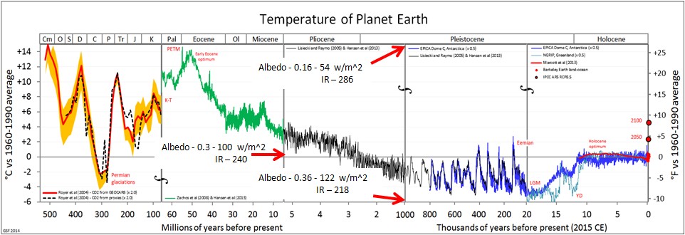 This temperature plot is really an IR and ALBEDO plot. See the spread sheet on the next page. The Albedo of the most recent time is about 0.3, based on what the consensus people, and others tell us. We know that albedo is higher in cold times and is lower in warm times. The consensus people tell us that is a result of warming and cooling that is caused by CO2 and orbit changes. They really do not have data for CO2 and orbit changes that could cause much of the temperature changes. They can match little pieces, here and there, but nothing impressive. They use the Albedo feedback to make up the difference. It is really the cause.